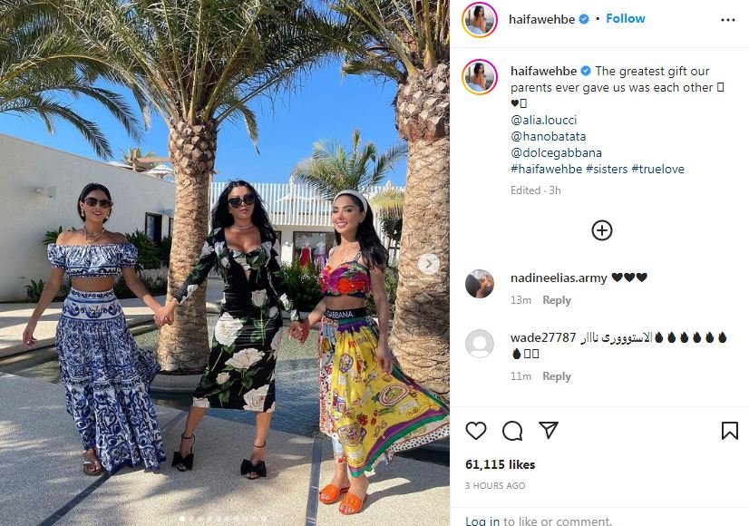 حيث ظهرت هيفاء مع شقيقتيها، بملابس كاجوال صيفية أثناء استمتاعهن، وكتبت: "أعظم هدية من الآباء وجودنا معا"، وتفاعل معهم الجمهور عبر السوشيال ميديا معبرين عن جمالهم.