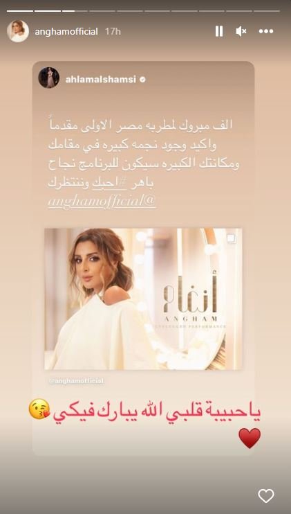 وكتبت أحلام، عبر خاصية ستورى على حسابها على إنستجرام، قائلة: "ألف مبروك لمطربة مصر الأولى مقدمًا وأكيد وجود نجمة كبير في مقامك ومكانتك الكبيرة سيكون للبرنامج نجاح باهر أحبك وننتظرك"، لترد عليها أنغام: "يا حبيبة قلبى الله يبارك فيكى".