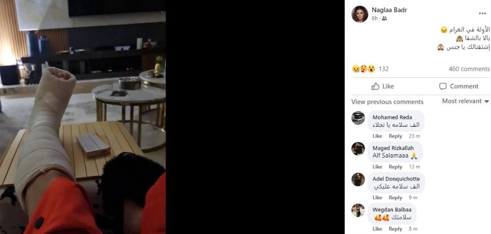 تعرضت الفنانة نجلاء بدر لإصابة أدت إلى كسر فى قدمها، ونشرت صورة قدمها فى الجبس، وعلقت: "الأولة فى الغرام.. يالا بالشفا.. اشتقنا لك يا جبس".