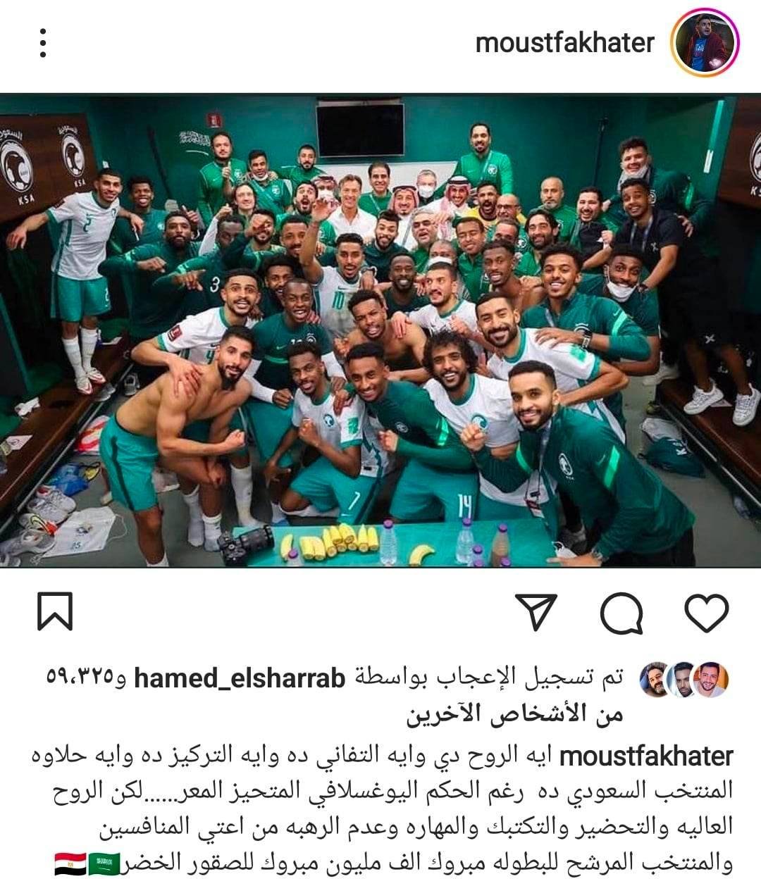 حيث نشر خاطر صورة للمنتخب السعودي عبر صفحته الشخصية على موقع إنستجرام، وعلق قائلا: "إيه الروح دي وإيه التفاني ده، وإيه التركيز ده وإيه الحلاوة دي، رغم الحكم اليوغسلافي المتحيز".