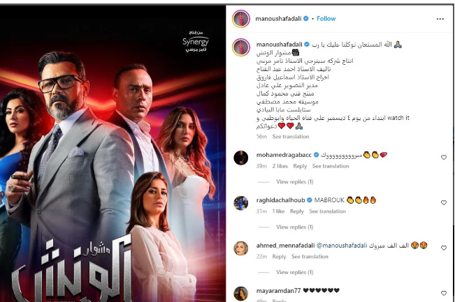 حيث علقت منة فضالى قائلة: "ابتداء من 4 ديسمبر مسلسل الونش.. والله المستعان توكلنا عليك يا رب.. دعواتكم" ولاقى البوستر إعجاب متابعيها وانهالت التعليقات المهنئة البوستر.