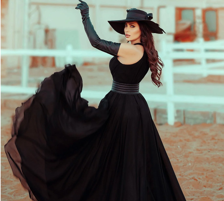 وجاءت نسرين طافش بإطلالة كلاسيكية أنيقة، حيث ارتدت فستان أسود وطويل وبقبعة "شابوه" أسود، وشعرها منسدلا على ظهرها.