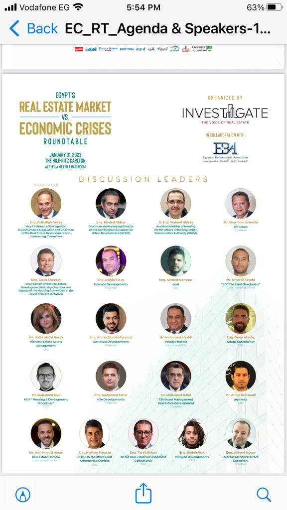 وتنقسم المائدة إلى جلستين رئيسيتين بعنوان «أدوات التغلب على الأزمات»، ويدير جلستي النقاش المهندس فتح الله فوزي، نائب رئيس مجلس إدارة «جمعية رجال الأعمال المصريين»، ورئيس لجنة التطوير العقاري والمقاولات، وسوف تشهد المائدة حضور نخبة من الخبراء العقاريين البارزين وهم: المهندس خالد عباس، رئيس مجلس الإدارة والعضو المنتدب لشركة العاصمة الإدارية للتنمية العمرانية، والدكتور المهندس وليد عباس، معاون وزير الإسكان لشئون هيئة المجتمعات العمرانية الجديدة، والأستاذ شريف حمودة، رئيس مجلس إدارة شركة «چي ڤي جروب»، والمهندس طارق شكري، رئيس غرفة التطوير العقاري، ووكيل لجنة الإسكان بمجلس النواب، والمهندس محي فراج، رئيس مجلس إدارة شركة «اب وايد» للتطوير العقاري، والمهندس أحمد منصور، الرئيس التنفيذي لشركة «CRED»، والأستاذ عمر الطيبي، الرئيس التنفيذي لقطاع التشغيل لشركة «TLD- THE LAND DEVELOPERS»، والأستاذة مها عبد الرازق، القائم بأعمال الرئيس التنفيذي لشركة «مصر لإدارة الأصول العقارية»، والمهندس أحمد أمين مسعود، رئيس مجلس إدارة شركة «منصات» للتطوير العقاري، والأستاذ محمد الصعيدي، الشريك والرئيس التنفيذي لشركة «إنفينيتي فينكس»، والمهندس عمر عتابي، الرئيس التنفيذي لشركة «عتابي للاستشارات الهندسية»، والأستاذ محمد علوي، الرئيس التنفيذي لشركة «HDP- HOUSING & DEVELOPMENT PROPERTIES»، والمهندس محمد طاهر، رئيس مجلس إدارة «النيل» للتطوير العقاري، والأستاذ محمد جلال، رئيس مجلس إدارة «TSM» لإدارة الأصول والاستثمار العقاري، والأستاذ عماد المسعودي، الرئيس التنفيذي لـ «عقار ماب»، والأستاذ محمد بناني، المدير التنفيذي لشركة «دار الخبرة للاستثمار العقاري» (ريد)، والمهندس هشام موسى، الرئيس التنفيذي لشركة «ريدكون» للمراكز الإدارية والتجارية، والمهندس طارق بهاء، الرئيس التنفيذي لشركة «مينا» لاستشارات التطوير العقاري، والمهندس بدير رزق، الرئيس التنفيذي لشركة «باراجون» للتطوير العقاري، والمهندس وليد مرسي، رئيس مجلس إدارة مكتب «دي سي آي بلس معماريون للاستشارات الهندسية».