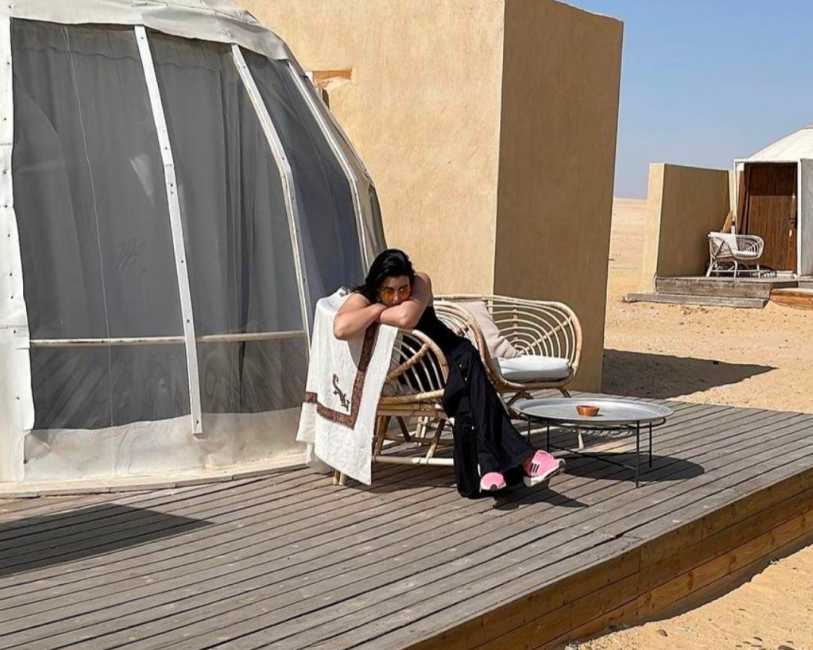 حيث ظهرت خليل بالصور بإطلالة هادئة حيث ارتدت فستانا صيفيا باللون الأسود، وحذاء رياضيا باللون الفوشيا، وبعض الإكسسوارات الرقيقة، وكان ذلك خلال زيارتها لوادي الريان بالفيوم، وكان المكان هادئا ولا يوجد سوى الرمال ومياه البحر.