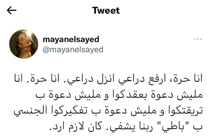 وخرجت مايان السيد، عن صمتها لترد على تلك الانتقادات، عبر حسابها الشخصي على موقع التدوينات القصيرة "توتير"، كاتبة:" انا حرة، ارفع دراعي انزل دراعي. انا حرة. انا مليش دعوة بعقدكوا ومليش دعوة ب تريقتكوا ومليش دعوة بتفكيركوا الجنسي ب "باطي" ربنا يشفي، كان لازم ارد".