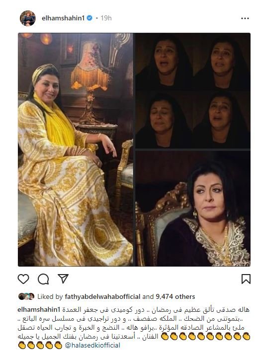 وكتبت إلهام شاهين، عبر حسابها على إنستجرام، قائلة: "هالة صدقى تألق عظيم فى رمضان دور كوميدى فى جعفر العمدة تموتنى من الضحك، الملكة صفصف ودور تراجيدى فى مسلسل سره الباتع مليء بالمشاعر الصادقة المؤثرة برافو هالة النضج والخبرة وتجارب الحياة تصقل الفنان أسعدتينا فى رمضان بفنك الجميل يا جميلة".