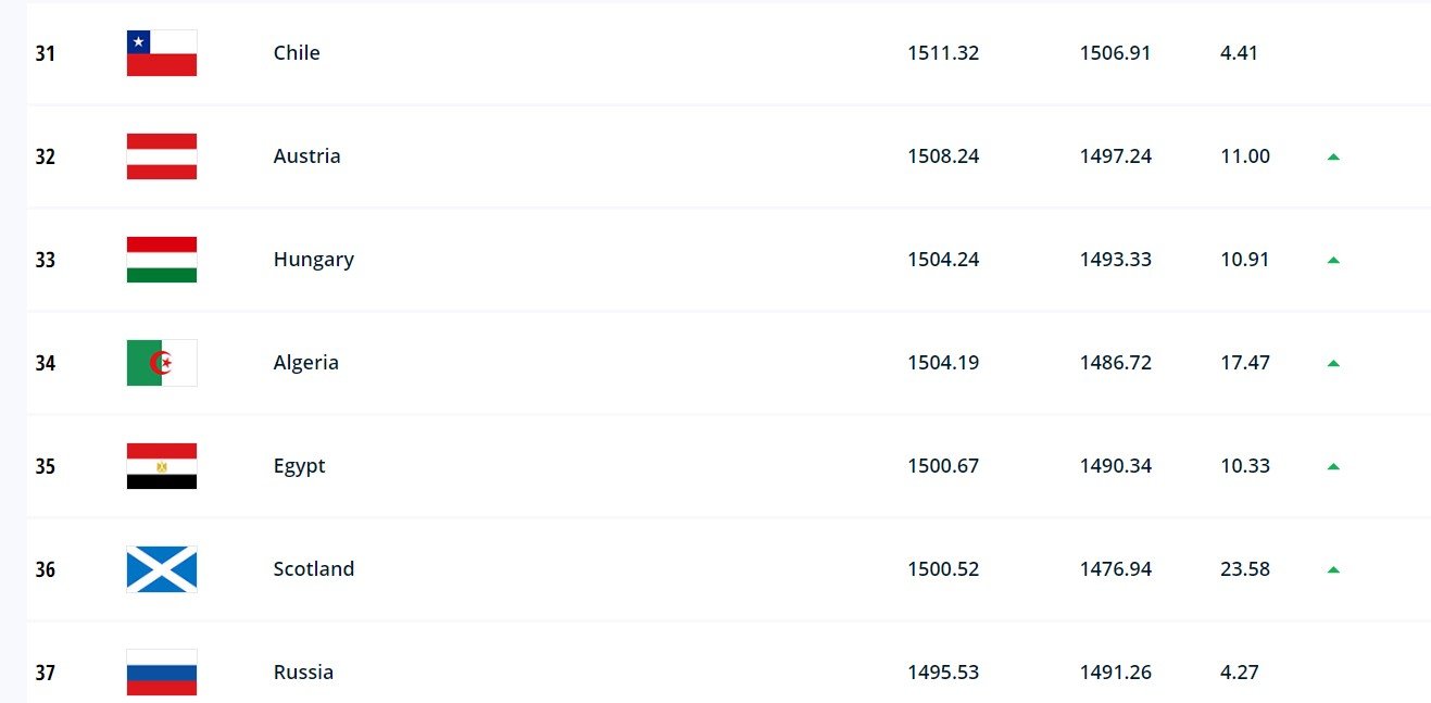 بينما ارتقى المنتخب الجزائرى ستة مراكز دفعة واحدة، ليحتل المركز الـ34 عالميًا والرابع قاريا.
