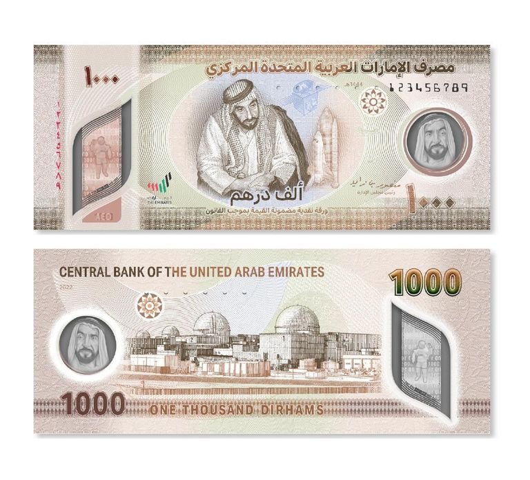 يطرح مصرف الامارات العربية المتحدة المركزي، الورقة النقدية الجديدة من فئة الـ1000 درهم، المصنعة من مادة البوليمر للتداول في الأسواق، وستكون متاحة في البنوك ومحلات الصرافة اعتباراً من يوم الأثنين 10 إبريل 2023. وحرص المصرف المركزي في تصميم هذه الفئة على إبراز قصة نجاح دولة الإمارات العربية المتحدة بالصور والرموز الحضارية والتنموية التي تعكس الإنجازات العالمية الرائدة للدولة من خلال تجسيد الرؤية الاستشرافية والطموح الذي تحول إلى واقع بأن تكون دولة الإمارات من رواد استكشاف الفضاء. وتبرز الخصائص الجمالية في تصميم هذه الورقة النقدية الجديدة باستخدام درجات متفاوتة ومتناسقة من اللون البني، المستخدم في الورقة النقدية من ذات الفئة المتداولة حالياً، بهدف تسهيل التعرف عليها من قبل الجمهور.