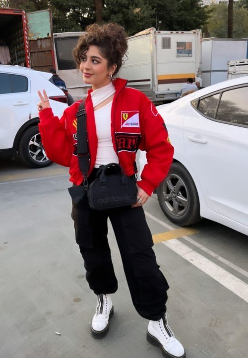 وظهرت بلوك كاجوال أنيق، بجاكيت أحمر وتوب أبيض، مع تسريحة مميزة لشعرها الكيرلي