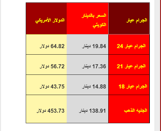 جاء سعر الذهب في الكويت اليوم بالدينار الكويتي والدولار الأمريكي كما يلي: