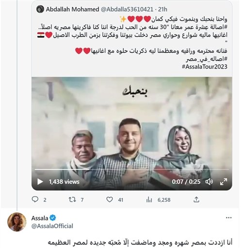وردت أصالة على جمهورها الذي أعاد نشر أغنيتها "بنحبك" بتغريدة قالت فيها: "أنا ازددت بمصر شهره ومجد وماضفت إلّا مُحبّه جديده لمصر العظيمه".