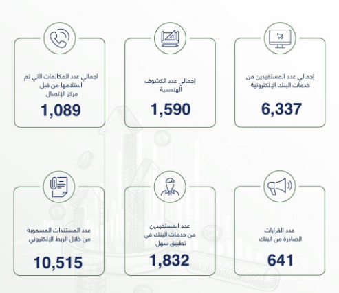 وذكر أن عدد القرارات الصادرة من البنك بلغ 641 قراراً، فيما بلغ عدد المكالمات التي استقبلها البنك نحو 1.09 مكالمة.