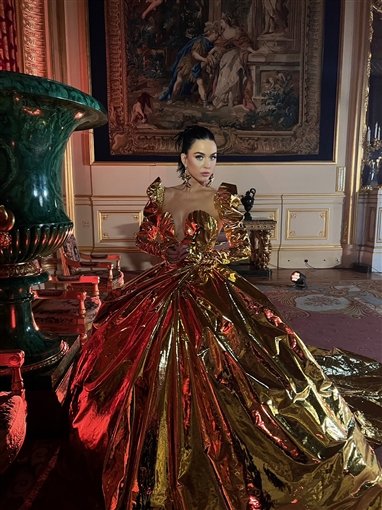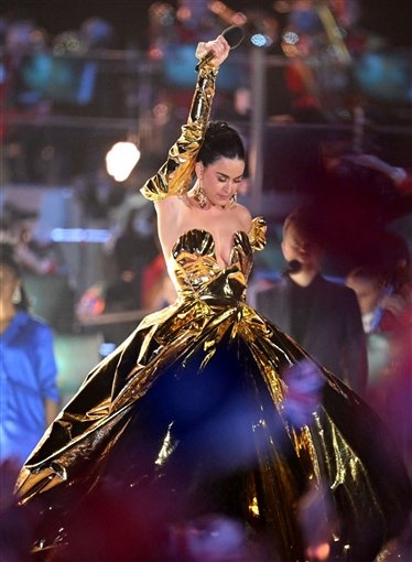 دخلت كاتي بيري إلى المسرح مرتدية فستان منفوش وذهب ياللون ومن الجلد المعدني، ومن تصميم فيفيان ويستوود.