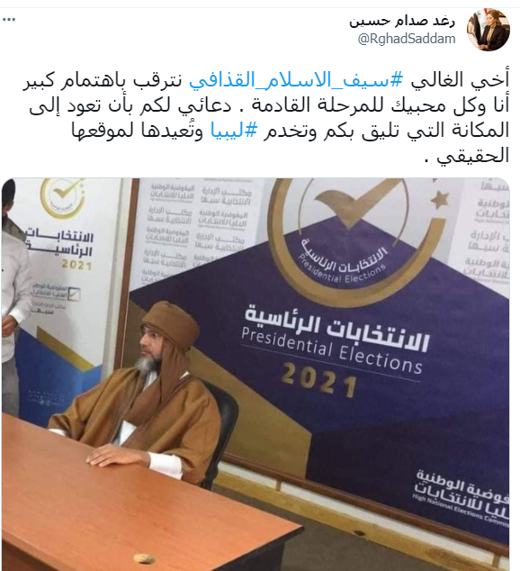 حيث كتبت رغد في تغريدة عبر حسابها الرسمي على "تويتر": "أخي الغالي سيف الإسلام القذافي نترقب باهتمام كبير أنا وكل محبيك للمرحلة القادمة".