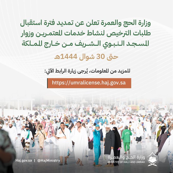 وأوضحت وزارة الحج والعمرة، عبر حسابها الرسمي على "تويتر"، أنه تقرر تمديد فترة استقبال طلبات الترخيص حتى 30 شوال 1444هـ.