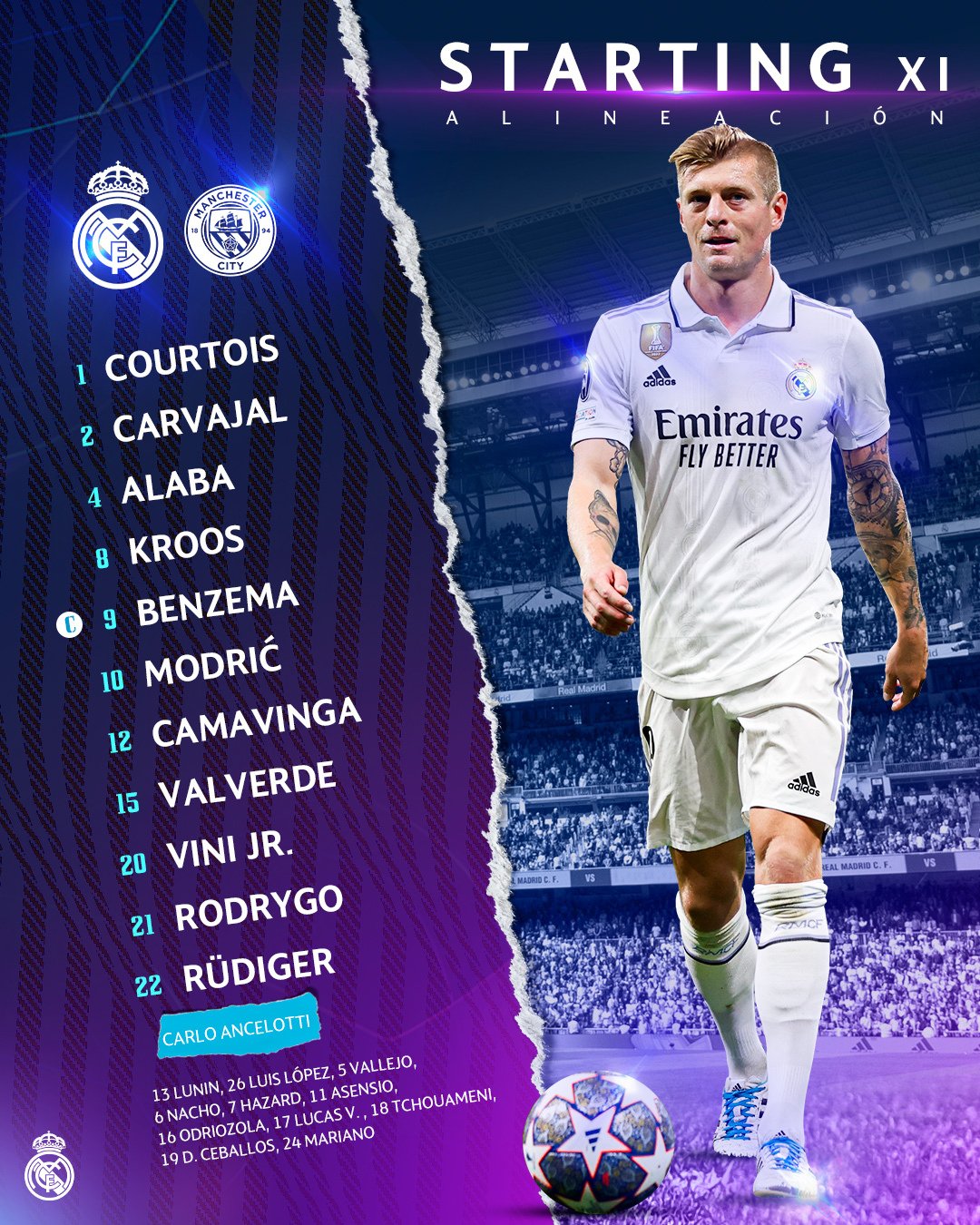 كشف الايطالي كارلو أنشيلوتي المدير الفني لفريق ريال مدريد الإسباني، عن التشكيل الرسمي لمباراة مانشستر سيتي الإنجليزي، المقرر اقامتها فى العاشرة مساء اليوم الثلاثاء، ضمن منافسات ذهاب الدور نصف النهائي للنسخة الحالية من مسابقة دوري أبطال أوروبا 2022-2023.
