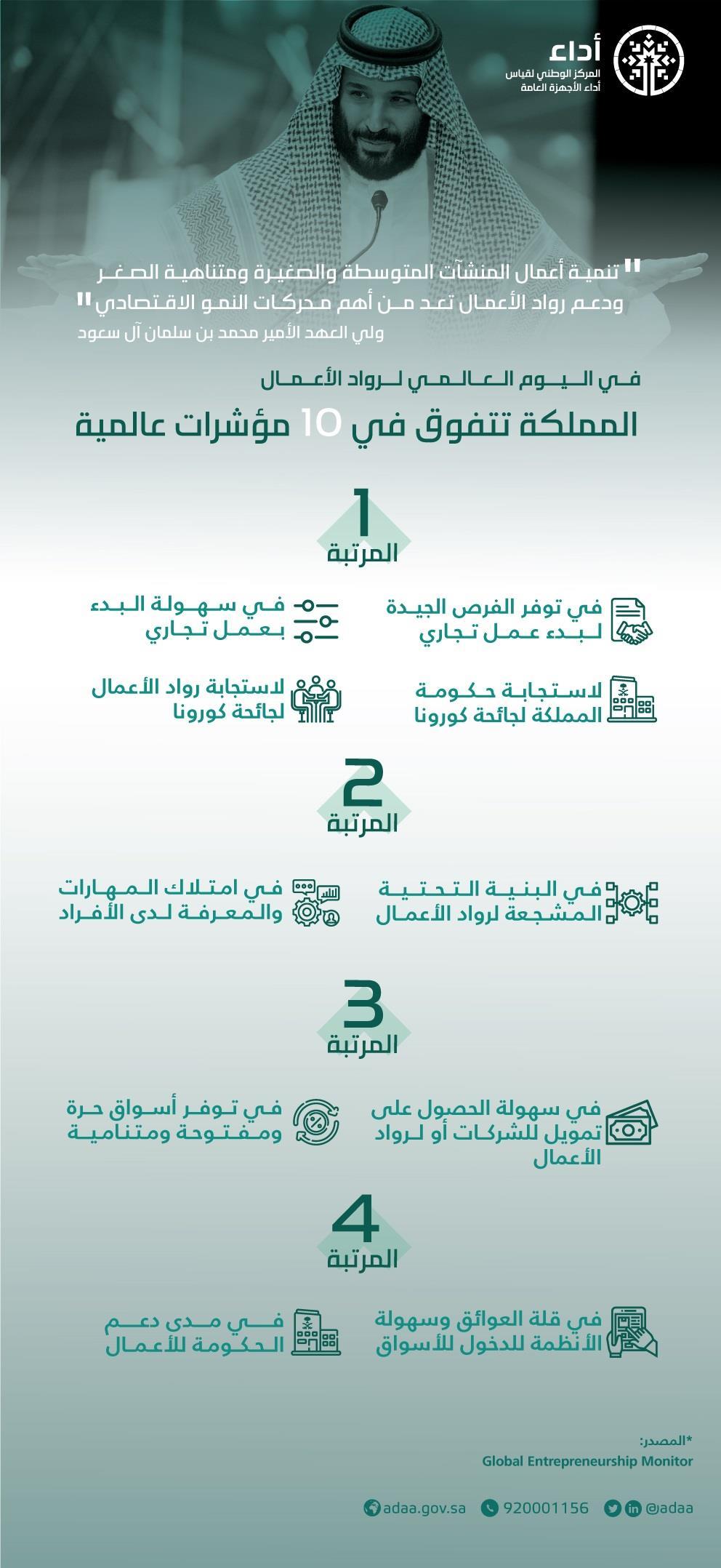 وأكّد مركز "أداء" تزامناً مع اليوم العالمي لرواد الأعمال بأن تقدّم المملكة في المؤشرات الدولية لريادة الأعمال تضمّن المرتبة الثانية في مؤشر "امتلاك المهارات والمعرفة لدى الأفراد"، ومؤشر "البنية التحتية" الذي يُعنى بسهولة الوصول إلى الطرق والمطارات، وكذلك المرافق، مثل الكهرباء والإنترنت وغيرها، وإمكانية الوصول إليها من قبل أصحاب المشاريع. فيما حققت المرتبة الثالثة في مؤشري: " سهولة الحصول على تمويل للشركات ورواد الأعمال" و"سهولة الدخول وديناميكيات السوق"، حيث يقيس الأخير مدى وجود أسواق حرة ومفتوحة ومتنامية متفوقة على 42 دولة، كما نالت المرتبة الرابعة عالمياً في مؤشري: "دعم الحكومة للأعمال" و"قلة العوائق وسهولة الأنظمة للدخول للأسواق" من بين 45 دولة.