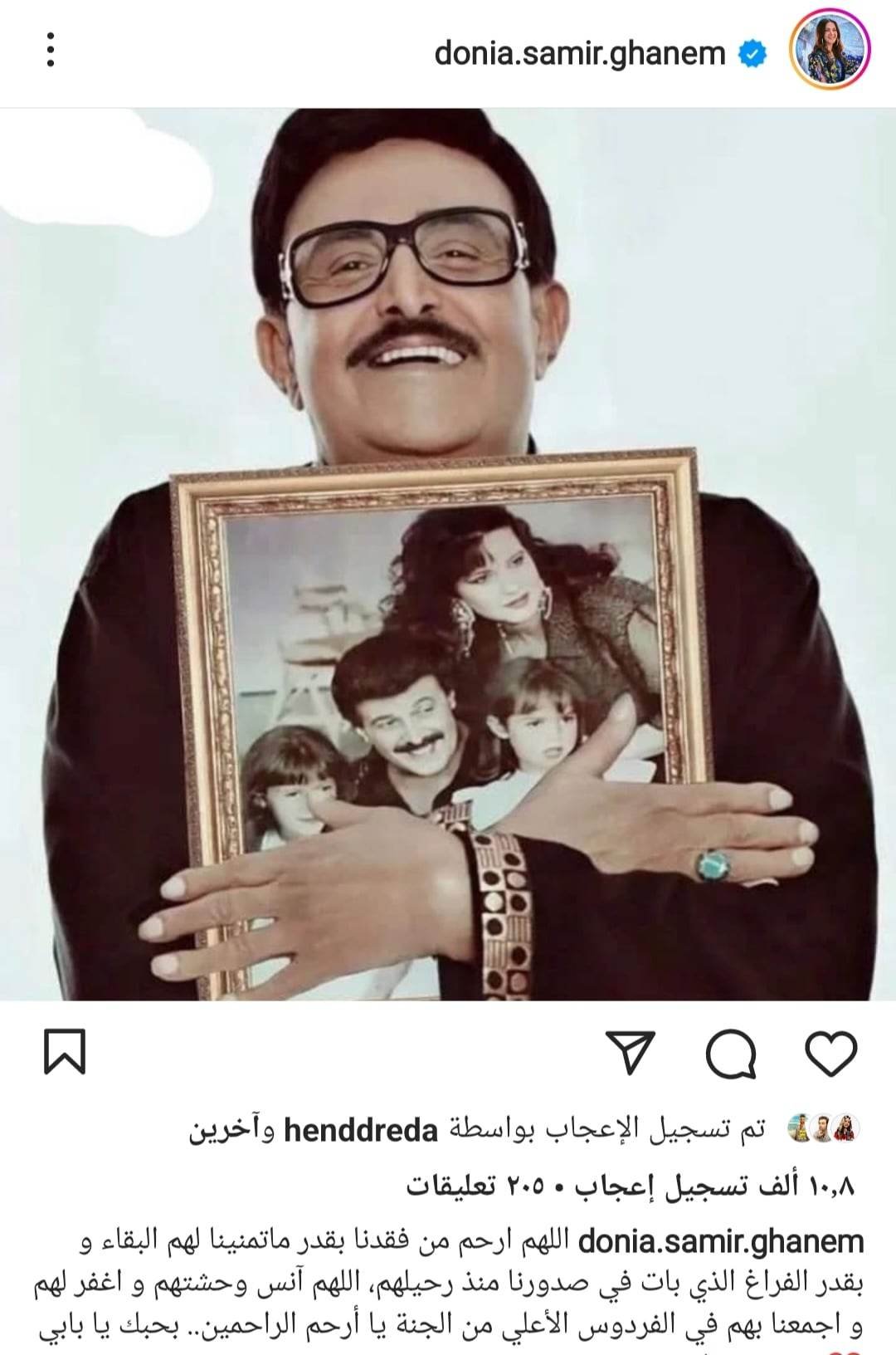 حيث كتبت دنيا سمير غانم:"اللهم ارحم من فقدنا بقدر ماتمنينا لهم البقاء و بقدر الفراغ الذي بات في صدورنا منذ رحيلهم، اللهم آنس وحشتهم و اغفر لهم و اجمعنا بهم في الفردوس الأعلي من الجنة يا أرحم الراحمين.. بحبك يا بابي #سمير_غانم".