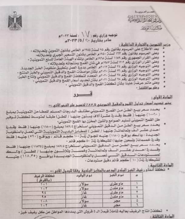 ونصّت المادة الأولي من التوجيه الوزاري، على نسخة منه، بأن يتم تعديل تكلفة تصنيع رغيف الخبز البلدي المدعم بالمخابز البلدية التموينية في القطاعين العام والخاص.