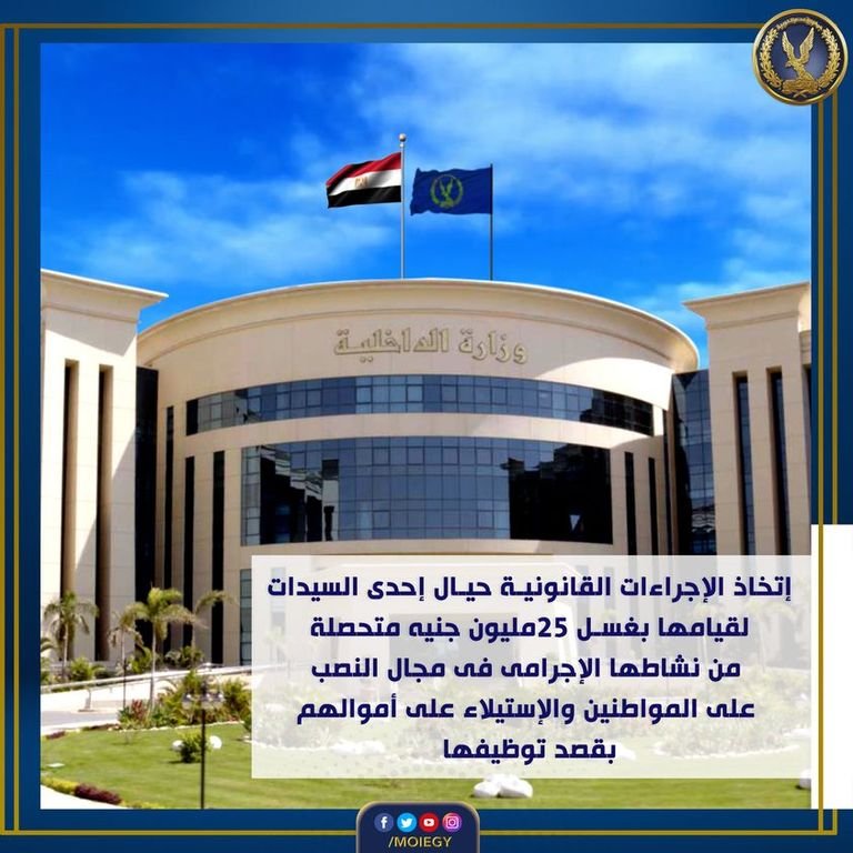 كشف البيان أن الإدارة العامة لمكافحة جرائم الأموال العامة، اتخذت الإجراءات القانونية حيال سيدة "لها معلومات جنائية ومقيمة في محافظة القاهرة، لممارستها نشاطا إجراميا".