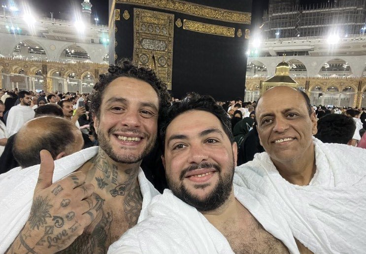 حيث ظهر أحمد الفيشاوي، وهو يرتدي ملابس الإحرام التى أظهرت حجم التاتوهات التى قام برسمها على جسده.
