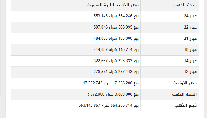 هذه الأسعار من الجمعية الحرفية للصياغة وصنع المجوهرات بدمشق محدثة بتاريخ اليوم الثلاثاء 6 يونيو 2023 دون إضافة المصنعية، وقد تختلف سعر مصنعية الذهب في سوريا من محل صاغة لآخر وهو: (أجر الصائغ عن كل جرام من المشغولات الذهبية).