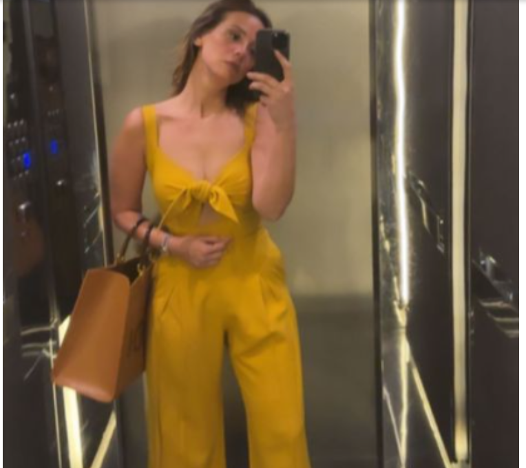 حيث ظهرت إيمان العاصى بإطلالة جريئة مرتدية "جمبسوت" باللون الاصفر، وتركت شعرها منسدلًا على كتفيها مما أثار تفاعل وإعجاب عدد كبير من جمهورها.