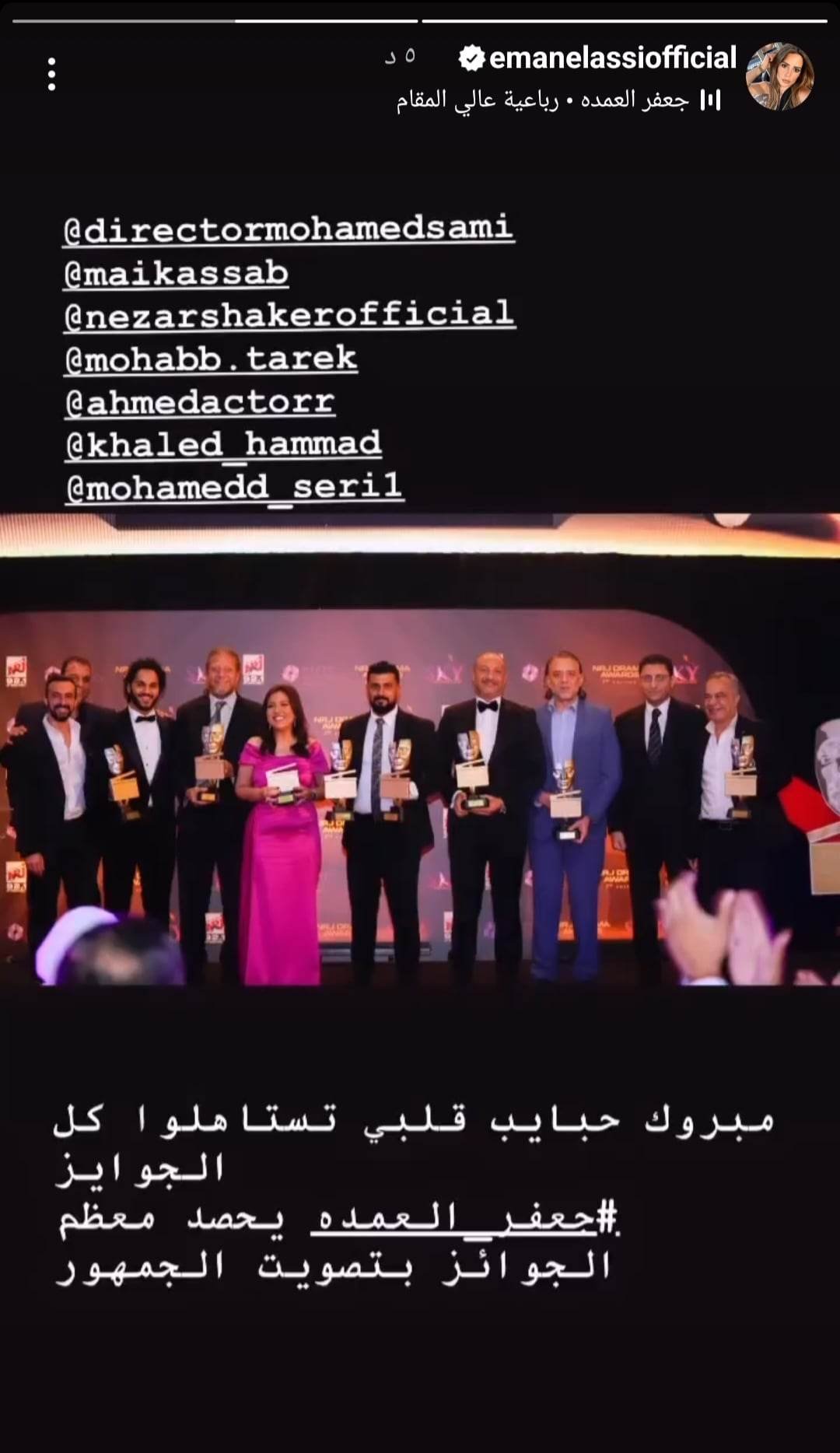 ونشرت العاصي عبر خاصية أستوري على صفحتها الشخصية بموقع الصور والفيديوهات القصيرة إنستجرام، صورة جماعية لأبطال "جعفر العمدة" خلال التكريم، وعلقت: "مبروك حبايب قلبي تستاهلوا كل الجوائز، جعغر العمدة يحصد معظم الجوائز بتصويت الجمهور".
