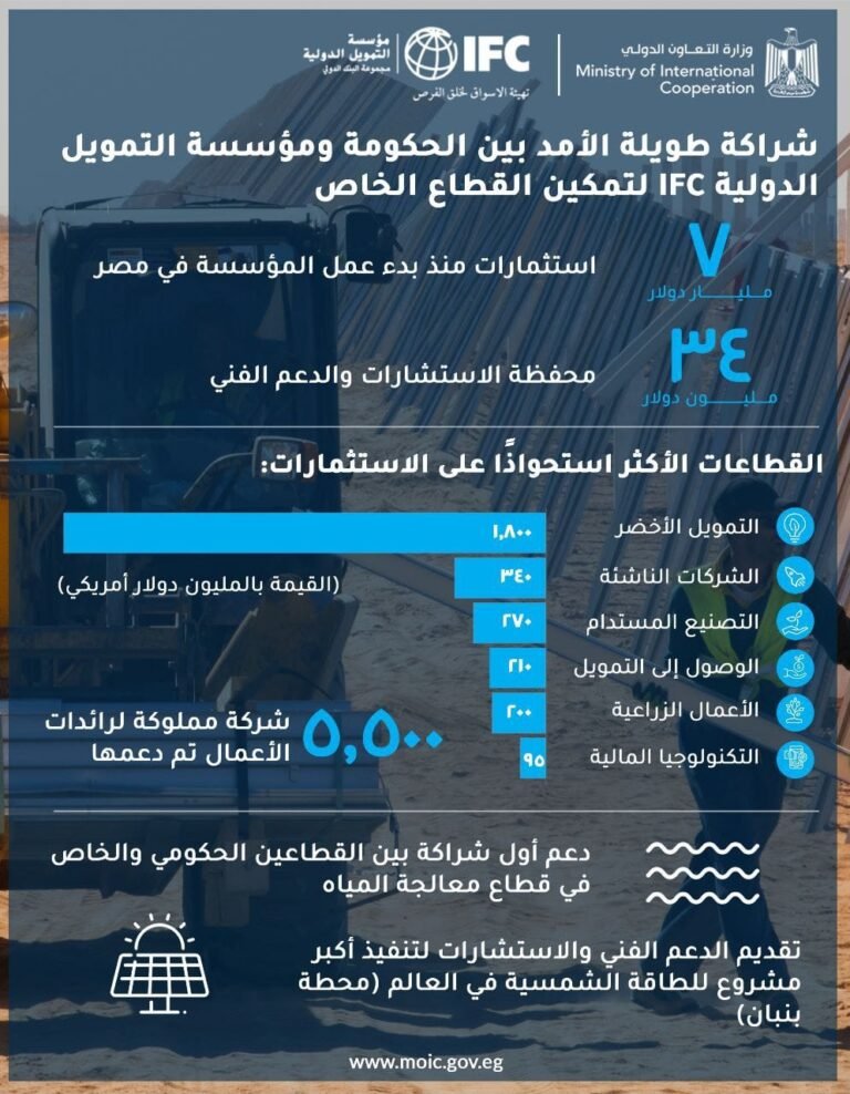 وتعد مؤسسة التمويل الدولية IFC، أكبر مؤسسة دولية تُركز على دعم وتمكين القطاع الخاص في الأسواق الناشئة من خلال الاستثمارات المباشرة التي تقوم بإتاحتها، إلى جانب تقديم المشورة والدعم الفني، وأيضًا حشد الاستثمارات الإضافية من جهات ومستثمرين آخرين.
