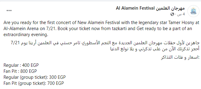 يذكر أن مهرجان العلمين يقدم مجموعة متميزة من الفعاليات الترفيهية الفنية أو الرياضية أوعروض الأزياء، كما تشهد الفعاليات عدد من الحفلات الفنية لكبار النجوم، منهم الفنان تامر حسني الذي يحيي حفلا هناك يوم الجمعة المقبلة 21 يوليو، يليه حفلات للنجوم: نانسي عجرم وراغب علامة، كاريوكي، إليسا، وأنغام، وحفل للموسيقار الكبيرعمر خيرت، ومغني الراب العالمي russ.