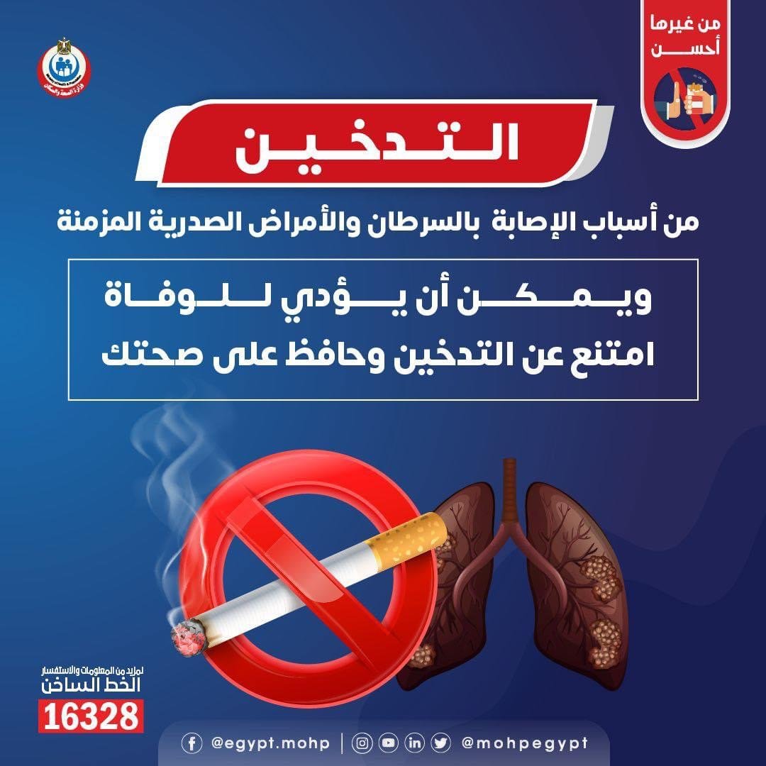 أكدت وزارة الصحة والسكان المصرية، أن التدخين من أسباب الإصابة بالسرطان والأمراض الصدرية المزمنة ويمكن أن يؤدى للوفاه.
