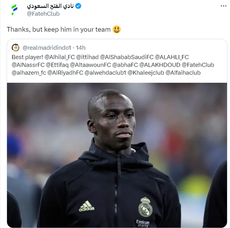 وبعد نهاية المباراة، نشر حساب تابع لجماهير ريال مدريد على منصة "إكس" للتواصل الاجتماعي (تويتر سابقا) صورة ميندي، وأشار لحسابات الأندية السعودية على المنصة، من أجل إقناعها بمحاولة ضم اللاعب الفرنسي.