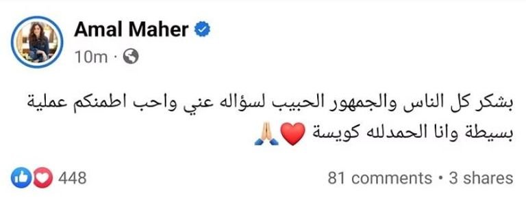 وطمأنت آمال ماهر جمهورها على حالتها الصحية الجيدة في رسالة نشرتها عبر مواقع التواصل الاجتماعي، قائلة: "بشكر كل الناس والجمهور الحبيب لسؤاله عني، وأحب اطمنكم.. عملية بسيطة وأنا الحمد لله كويسة".