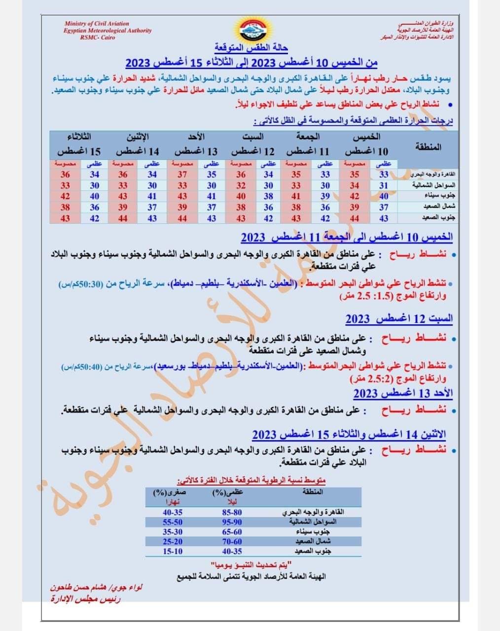 وفيما يلي بيان درجات الحرارة من اليوم الخميس وحتى الثلاثاء المقبل: