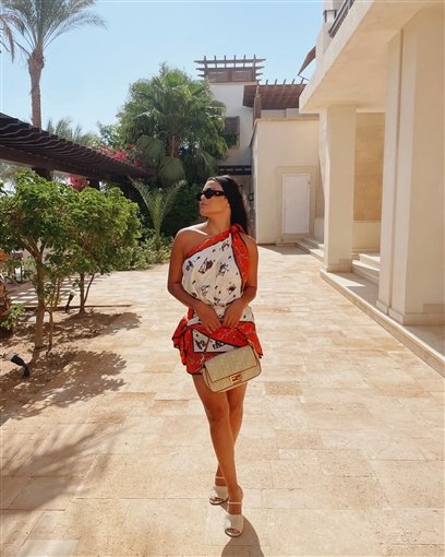 مع حقيبة متوسطة الحجم باللون البيج مع حزام باللون البني، وسعر الحقيبة 3، 490 دولار أي 108 ألف جنيه مصري.