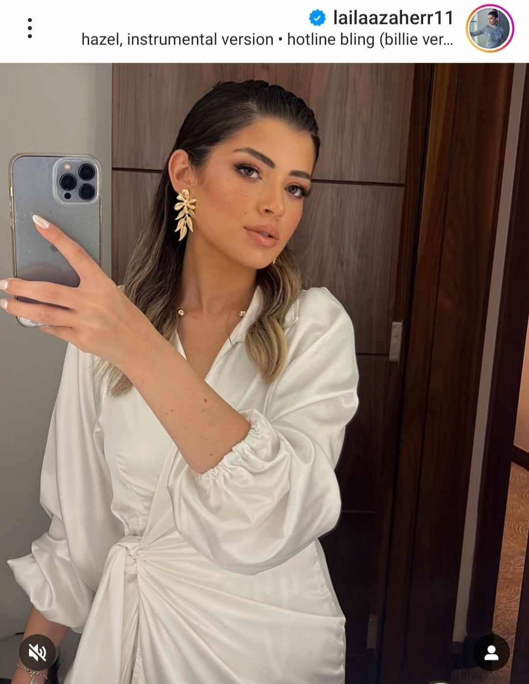 حيث ظهرت ليلى بالصورة بإطلالة متميزة، حيث ارتدت فستانا رقيقا باللون الأبيض، وبعض الإكسسوارات الرائعة، ومن الناحية الجمالية اعتمدت على المكياج الهادئ الذي زاد من جمالها وتألقها.