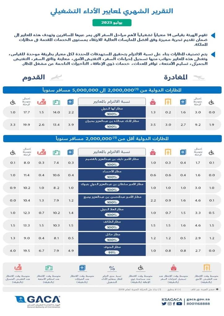 أصدرت الهيئة العامة للطيران المدني السعودية، تقريرها الشهري عن أداء مطارات المملكة الدولية والداخلية، لشهر يوليو 2023م، وفقاً لأربعة عشر معياراً أساسياً لقياس الأداء، وذلك تطبيقاً للتوجُّهات الإستراتيجية التي تستهدف تجويد الخدمات المُقدَّمة للمسافرين، ورفع مستواها، وتحسين تجربة المسافر في مطارات المملكة. ونال كلٌ من مطار الملك عبد العزيز الدولي، ومطار الملك فهد الدولي، ومطار أبها الدولي، ومطار الأمير نايف بن عبد العزيز بالقصيم، ومطار القريات المراكز المتقدمة في التقرير، إذ اتبعت الهيئة مبدأ الشفافية تجاه تقييم أداء المطارات، حيث قُسمت إلى خمس فئات، تبدأ بفئة المطارات الدولية التي يزيد أعداد المسافرين فيها عن 15 مليون مسافر سنوياً، وحصل مطار الملك عبد العزيز الدولي بجدة فيها على المركز الأول بنسبة التزام بلغت 91%، بينما جاء ثانياً مطار الملك خالد الدولي بالرياض بنسبة التزام وصلت إلى 82%.