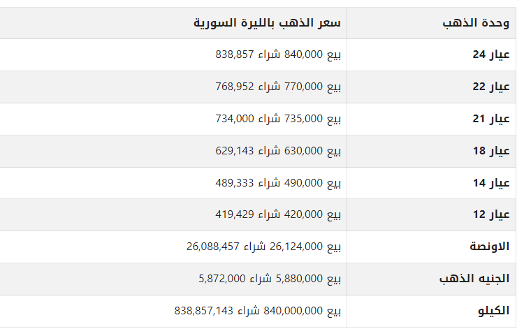 أسعار الذهب في سوريا اليوم