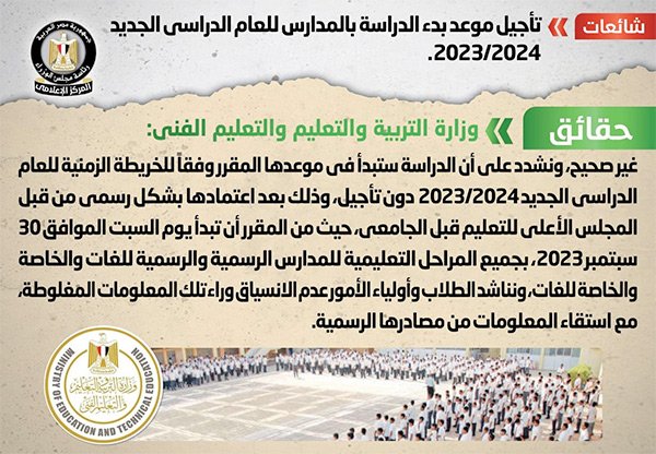 وأكدت وزارة التربية والتعليم أنه لا صحة لتأجيل موعد بدء الدراسة بالمدارس للعام الدراسي الجديد 2023/2024، مشددة على أن الدراسة ستبدأ في موعدها المقرر وفقاً للخريطة الزمنية للعام الدراسي الجديد 2023/2024 دون تأجيل، وذلك بعد اعتمادها بشكل رسمي من قبل المجلس الأعلى للتعليم قبل الجامعي، حيث من المقرر أن تبدأ يوم السبت الموافق ٣٠ سبتمبر ٢٠٢٣، بجميع المراحل التعليمية للمدارس الرسمية والرسمية للغات والخاصة والخاصة للغات، مناشدةً الطلاب وأولياء الأمور عدم الانسياق وراء تلك المعلومات المغلوطة، مع استقاء المعلومات من مصادرها الرسمية.