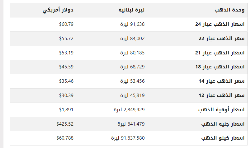 أسعار الذهب في لبنان اليوم