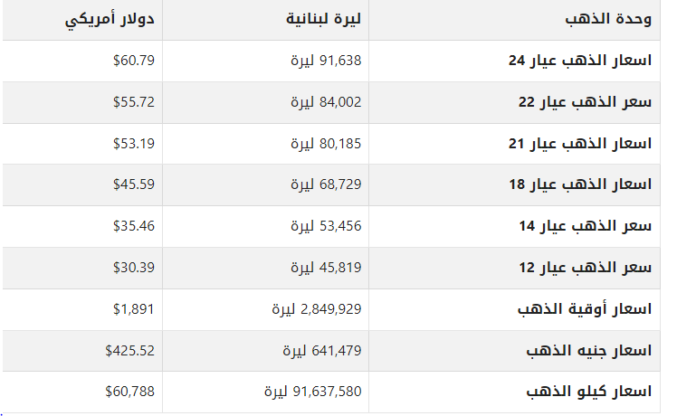 أسعارالذهب في لبنان اليوم