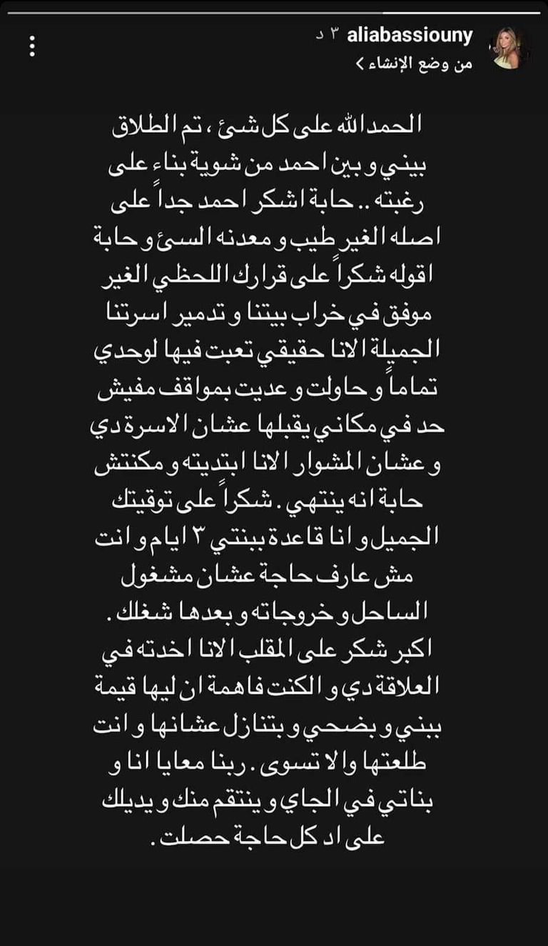 وقالت "علياء": "الحمد لله على كل شيء، تم الطلاق بيني وبين أحمد سعد منذ قليل بناء على رغبته.. أحب أن أشكره على أصله غير الطيب ومعدنه السيئ".