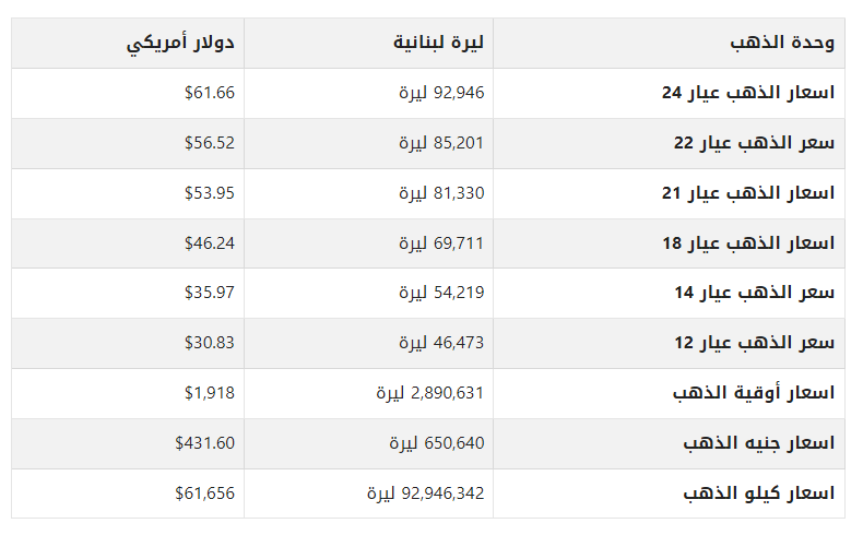ينشر موقع خليجيون نيوز متوسط أسعار الذهب في لبنان خلال تعاملات اليوم الخميس 07 سبتمبر 2023.