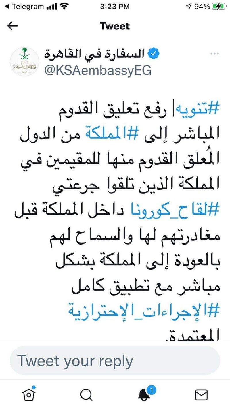 أصدَرت السفارة السعودية في مصر تنويهًا برفع تعليق القدوم المباشر إلى المملكة من الدول المُعلق القدوم منها للمقيمين في المملكة الذين تلقوا جرعتي لقاح كورونا داخل المملكة قبل مغادرتهم لها، والسماح لهم بالعودة إلى المملكة بشكل مباشر مع تطبيق كامل الإجراءات الاحترازية المعتمدة.