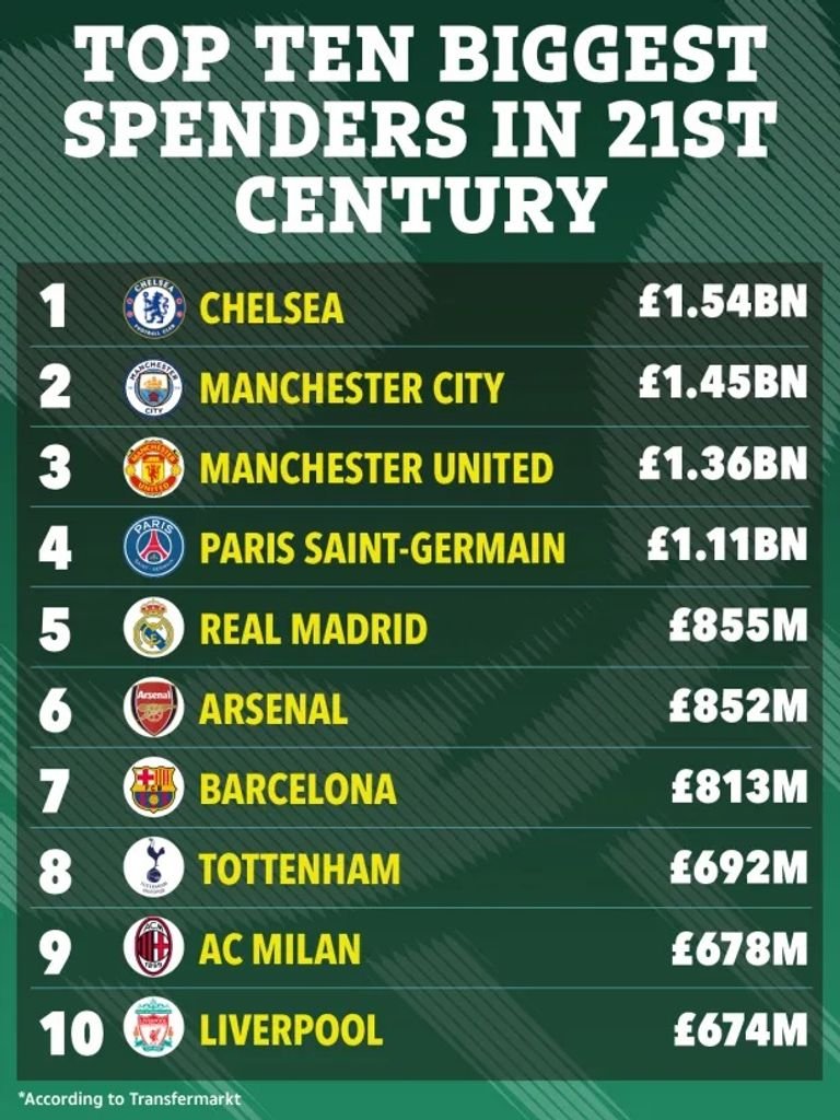 وتصدر نادي تشيلسي الإنجليزي قائمة أكثر الأندية إنفاقاً في القرن الحادي والعشرين، بينما تواجد الستة الكبار من إنجلترا في قائمة أبرز 10 أندية في هذا الصدد مع ريال مدريد وبرشلونة الإسبانيين وباريس سان جيرمان الفرنسي وميلان الإيطالي.