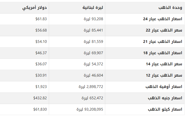 أسعار الذهب في لبنان اليوم
