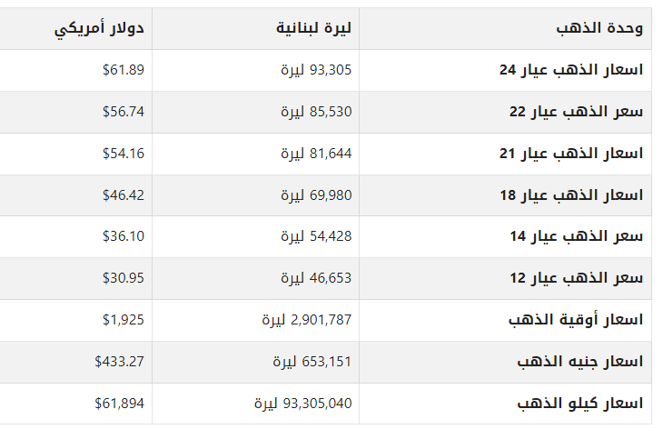 تعرف على أسعار الذهب في لبنان اليوم السبت 16 سبتمبر 2023