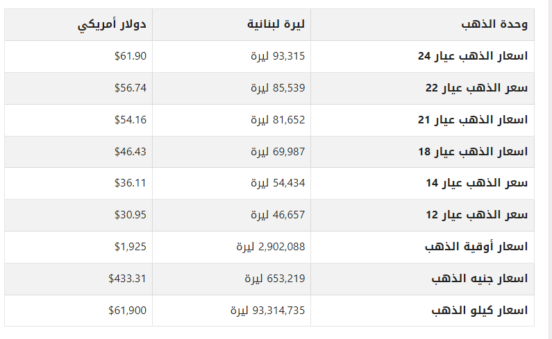 تعرف على أسعار الذهب في لبنان اليوم الأحد 17 سبتمبر 2023