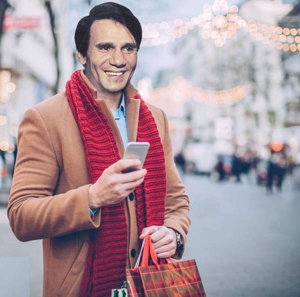 أما العندليب الأسمر عبد الحليم حافظ، فظهر ممسكاً بهاتف محمول ويحمل هدايا.