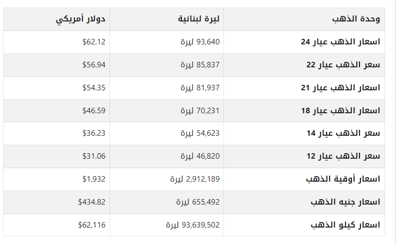 تعرف على أسعار الذهب في لبنان اليوم الأربعاء 20 سبتمبر 2023
